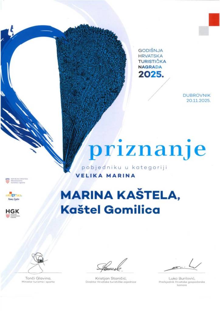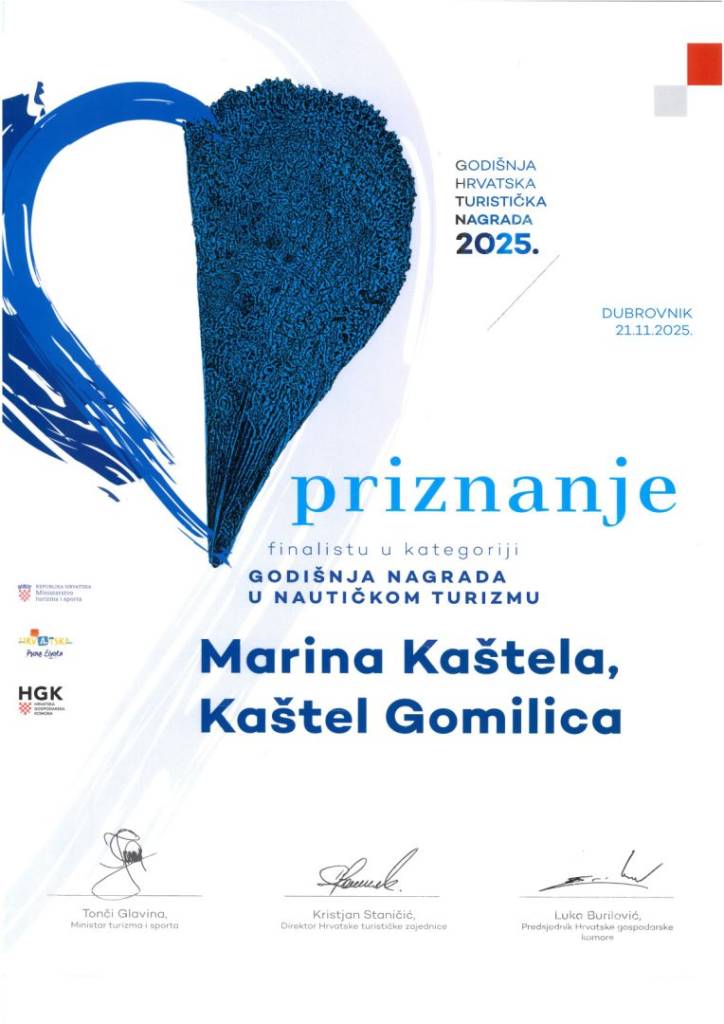 Ovogodišnje priznanje rezultat je standarda koje Marina Kaštela predano njeguje već dugi niz godina. Stručna komisija posebno je istaknula visoku razinu sigurnosti i kvalitete usluge, cjelovitu ponudu nautičkih i charter sadržaja, održivo upravljanje prostorom i brigom o okolišu te snažnu povezanost sa zajednicom. Ulaganja u sport, kulturu i dugogodišnji humanitarni rad sastavni su dio modela razvoja koji Marina Kaštela gradi više od dva desetljeća, a koji je prepoznat i nagrađen kao primjer dobre prakse u hrvatskom turizmu.